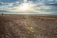 A rugged dirt track in the California desert, surrounded by open plains and mountains. The clear blue sky with visible sun provides ample sunlight to the coastal landscape. A sunny day for off-road adventures.