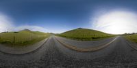 A scenic drive through California's rural landscape. The road curves down towards two grassy hills, with majestic mountains in the background. The open space and lush vegetation create a picturesque view.