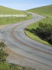 A scenic drive through the California countryside. The road meanders through lush green fields and rolling hills, with clear skies above. The elevated highway offers stunning views of the rural landscape.