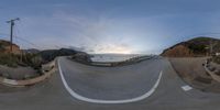 A breathtaking view of California's iconic Pacific Coast Highway, winding along the coastal cliffs. Cars and a bicycle rider traverse the scenic road, with the ocean and mountain ranges in the backdrop. A perfect dawn drive in Big Sur.