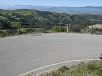 A scenic drive on a highland road in California, USA. The asphalt road winds through the picturesque landscape, surrounded by mountains, grass, and trees. Clear skies and elevated curves add to the beauty of this rural area.
