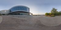 Panoramic view of a skateboard park in Los Angeles, California. Modern architecture of the residential building stands out against the clear sky. Skateboarders race on the asphalt track, surrounded by trees and open spaces.