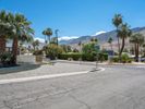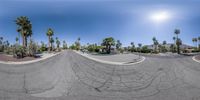 A sunny and quiet street in Palm Springs, California. Modern architecture blends with the natural beauty of palm trees. Clear skies and endless roads create a peaceful suburban oasis in the Sonora Desert.