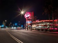 This image captures the ambiance of a Californian night in the suburbs. A city street is illuminated by street lights and the glow from a local restaurant and cafe. The clear sky above adds to the picturesque scene. The road surface, made of asphalt, compliments the curbs and traffic lights that line the street. This photo showcases the combination of artificial and natural light, creating a warm and inviting atmosphere. It represents the vibrant nightlife and dining culture of California.