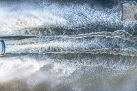 Aerial view of a suburban neighborhood in Los Angeles, California. The grey and blue pattern of roads and residential areas creates a top-down automotive design. Hood of motor vehicles, covered in tints and shades, gives a denim-like texture. Open spaces and wet road surfaces add to the unique charm of this high river suburb.