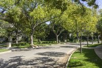 A sunny day in Los Angeles, California. The low, suburban architecture casts hard shadows on the road and walkways. Beautifully manicured lawns and groves of trees create a peaceful neighborhood landscape.