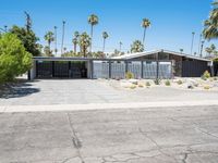 A modern residential home in Palm Springs, California. The mid-century villa stands out against the clear sky. The sleek architecture and asphalt driveway lead to a spacious carport and parking garage. A perfect day in the Sonora Desert.