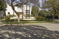 A beautiful suburban neighborhood in Los Angeles, California. The clear sky highlights the magnificent architecture of the residential buildings and villas. Lush trees and purple rain add a touch of nature to this idyllic real estate area.
