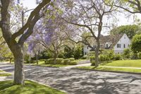 A picturesque residential area in Los Angeles, California, with well-maintained homes and lush green lawns. Beautiful spring vegetation and clear skies make it an ideal suburb in the USA.