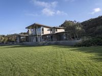 A modern residential home located in a suburban neighborhood in Los Angeles, California. The house is surrounded by an open green space with a well-maintained grass surface. The clear blue sky provides a picturesque backdrop for this beautiful property.