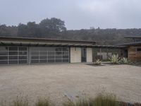 A modern suburban villa in California, situated in the midst of a foggy morning. The grey sky adds to the gloomy atmosphere. The house is surrounded by a courtyard, driveway, and a backyard with a vineyard.