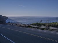 an empty highway near a large body of water with an ocean and cliffs in the background