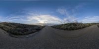 A straight road at sunset in California, near the ocean and surrounded by trees. The fisheye lens captures the expansive coastal landscape, with a clear sky and calm waves. A serene evening in a natural environment.