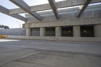 A modern underground parking structure in California. The concrete facade with windows creates a sleek and architectural profile. Empty road allows for a clear view of the urban infrastructure on a sunny day.