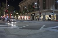 A vibrant night scene in Los Angeles, California. Classic architecture and boutique shops illuminate the downtown area. Pedestrians stroll along the sidewalk, surrounded by the glow of street lights and the buzz of the city.