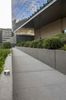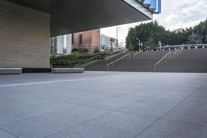 A fisheye lens captures a straight road lined with modern architecture in Los Angeles, California. Monochrome cityscape contrasts with the vibrant red ribbon in the foreground. A glimpse into the vibrant urban life of this coastal metropolitan area.