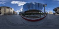 a view of the street from a fisheye lens, with buildings behind it and a red ribbon in the foreground