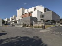 a modern office building with gray blocks surrounding it and cars parked in the parking lot