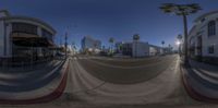 A vibrant street in Los Angeles, California. Modern architecture lines the road, with storefronts and office buildings dominating the business district. Palm trees and clear skies add to the city's urban charm.