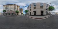 The vibrant city of Los Angeles, California, captured in a unique fish eye view. The bustling metropolis showcases its iconic skyline, high-rise buildings, and bustling city streets. The yellow line creates a striking contrast against the urban landscape.