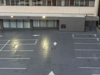 an empty parking lot with multiple lines on the floor and several windows on one side and arrows pointing up at left side