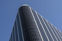 A modern high-rise office building in downtown Los Angeles, California. The sleek and futuristic design stands tall against a clear blue sky. A prime example of urban architecture in the bustling metropolitan area.