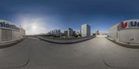 A 360-degree view of the cityscape of Los Angeles, California, USA. The modern architecture, high-rise buildings, and clear sky create a stunning urban design. The fisheye lens adds a unique perspective to this metropolitan area.