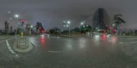 A vibrant night scene in downtown Los Angeles, California. The wet asphalt streets reflect the city lights, creating a beautiful urban landscape. Traffic lights illuminate the busy road, showcasing the modern architecture and bustling city life.