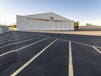 This is an image of a parking lot in Los Angeles, California, USA. The city is known for its iconic architecture and urban landscape. The photo shows several cars parked on the asphalt surface, surrounded by houses and commercial properties. In the distance, there is an open space with a park and a line of trees. Nearby, there is a factory and a road surface leading to the airport hangar. The clear sky above highlights the human settlement and the industrial warehouse. This photo represents a typical day in Los Angeles, showcasing the city's diverse range of infrastructure and public spaces.