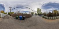 a fisheye lens photograph of trash cans and wires in an alleyway off a residential street