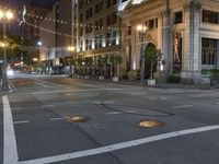 the street in front of the building is empty and quiet at night time, with no traffic or pedestrians