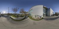a fisheye lens shows a photo of a building outside by itself with a blue sky