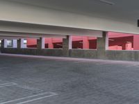 A parking lot in Los Angeles, California. The grey asphalt surface is lined with rectangular buildings. The composite material flooring contrasts with the road surface. An urban scene with a modern architectural design.