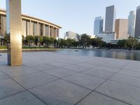 This is an image of downtown Los Angeles, California, USA. The photo captures the cityscape at dawn, with the clear sky reflecting in the water. The buildings and architecture of the metropolitan area are highlighted, with the rooftops and open spaces visible. A walkway and road surface can be seen, adding to the urban feel of the scene. This photo represents the vibrant and dynamic atmosphere of downtown Los Angeles.