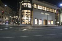 This image captures the iconic architecture and vibrant cityscape of Los Angeles, California, USA. The photo shows a well-lit road at night surrounded by stylish buildings and mixed-use shops. The classic architecture and street lights give the scene a timeless feel. The metropolitan area of Los Angeles shines brightly, with a mix of urban and boutique storefronts. The dark sky and artificial lights create a captivating ambiance. This photo encapsulates the lively energy and charm of Beverly Hills, a town known for its expensive shops and luxurious atmosphere during the Christmas season.
