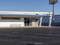 This is an image of a modern residential building in Los Angeles, California, USA. The architecture is characterized by its clean lines and sleek design, reflecting the urban and suburban landscape of the city. The building stands against a clear sky, with the classic architecture of other structures visible in the background. The road and asphalt surface lead to the open spaces and green areas surrounding the property. This photo represents the real estate and architectural diversity of Los Angeles, capturing the essence of city living in California.