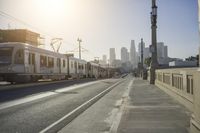 A sunny day in downtown Los Angeles, California. The clear sky showcases the city's impressive architecture and the iconic Sixth Street Bridge. The bustling urban metropolis with its stunning cityscape and skyline is a testament to the vibrant energy of this American city.
