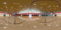 Aerial view of a basketball stadium in California, USA. The wooden floor and red seats create a vibrant atmosphere. The elevated position offers a top-down perspective of the open space. A perfect day for a game.