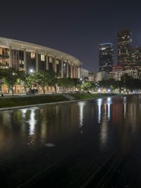 A stunning view of the Los Angeles skyline at night. The city's famous skyscrapers lit up, reflecting onto the calm waters of a nearby lake. The artificial lights create a beautiful cityscape against the clear night sky.