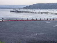 there are many cars going down the road to the beach and pier in the background