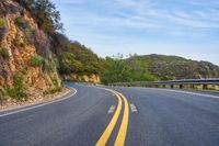 An early morning drive on a winding mountain road in California, USA. The asphalt stretches out as far as the eye can see, surrounded by low-hanging clouds and majestic mountain landscape. A perfect straight-aways and S-curves await adventure seekers.
