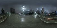 A stunning view of downtown Los Angeles at night, captured through a spherical fisheye lens. The city's modern architecture and high-rise buildings are reflected in the wet streets, creating a mesmerizing cityscape.