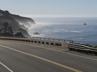 The iconic Pacific Coast Highway in California, USA, runs along the stunning coastal landscape. The empty highway winds through the rocky shoreline, with the ocean as a backdrop. Majestic cliffs add drama to the scene.
