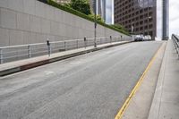 This image captures the modern urban design of downtown Los Angeles, California. The low, yellow concrete walls lining the street create a sleek and contemporary look. Cars are parked along the road, reflecting the bustling city life. The infrastructure includes guard rails and a well-maintained road surface. The street leads to a highway entrance/exit ramp, showcasing the connectivity of the metropolitan area. The office buildings in the background convey the business district vibe of the city. This photo showcases the architectural beauty and urban atmosphere of downtown Los Angeles.