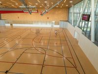 an indoor gymnasium with basketball court and lighting beams and lots of windows with a sign on the wall