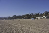 A scenic view of the coastal area in Los Angeles, California. The sandy beach stretches along the shore, leading to the open space of the ocean. Surrounded by mountains and trees, it's a perfect destination for nature lovers and a recreational spot for a vacation.