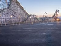 an empty area with a roller coaster and a tall structure in the background at dusk