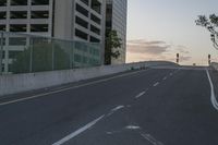 This is an image of a city street in Los Angeles, California, USA. The photo was taken at dusk, capturing the cityscape with a clear sky overhead. The modern architecture of the large building creates a striking contrast against the urban design of the residential area. The empty street and skateboarders reflect the city life winding down at the break of day. The infrastructure of the road surface, highway entrance, and exit are visible, along with the incline and Armco barrier. This photo represents the bustling metropolitan area and business district of Los Angeles.