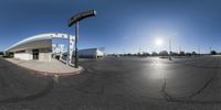A unique perspective of the Los Angeles cityscape, with a clear sky overhead and modern architecture lining the streets. The road pavement creates a captivating composition with the upside-down lens effect.