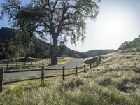 This image captures the beautiful landscape of rural California, USA. A winding road made of asphalt cuts through the lush green grass and pasture. The split rail fence marks the boundary of the agricultural land, adding a rustic touch to the natural environment. The clear sky and abundant sunshine create a bright and sunny day, making it perfect for recreational activities and enjoying the wilderness. The trees in the foreground provide shade and add to the overall scenic beauty of this picturesque location in California.